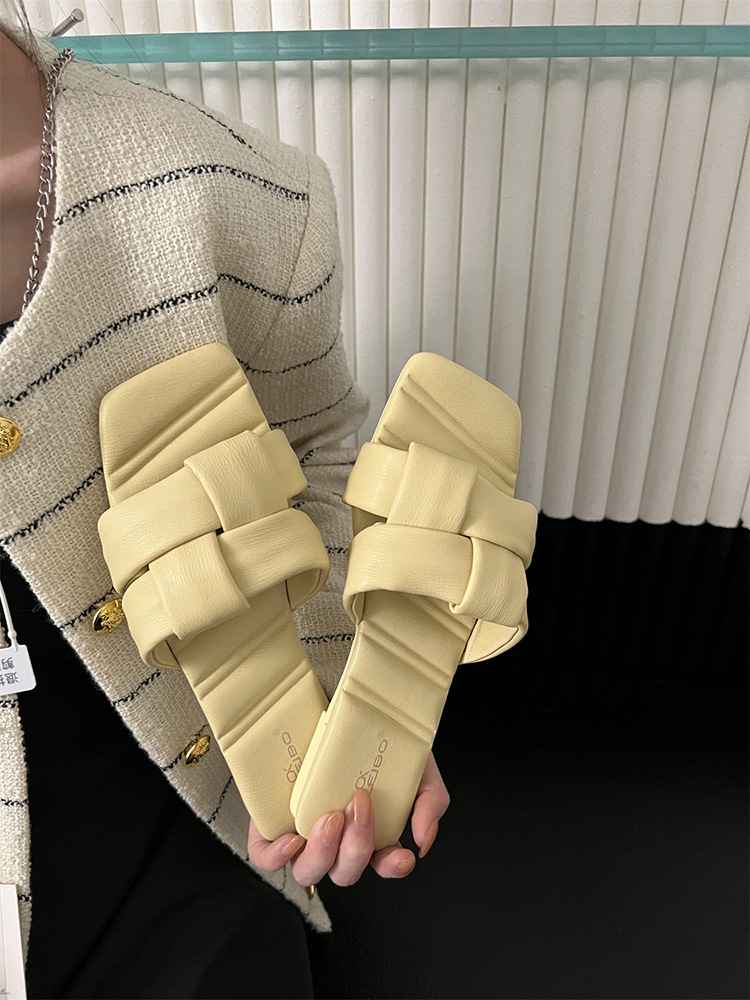 This design is fantastic! Bare toed square toe woven flat bottom slippers for women wearing outdoors 2023 summer soft bottom beach sandals