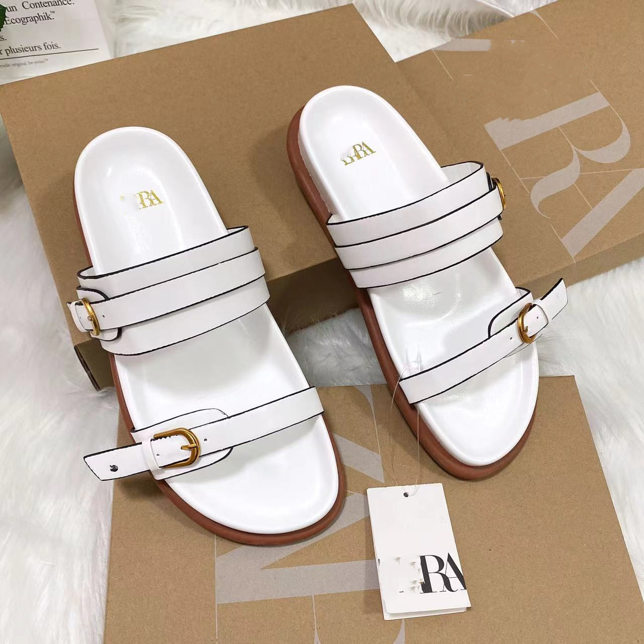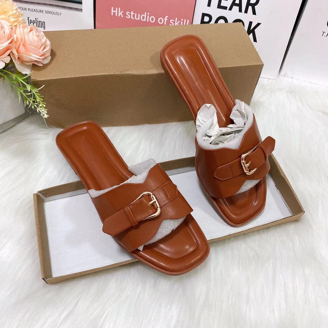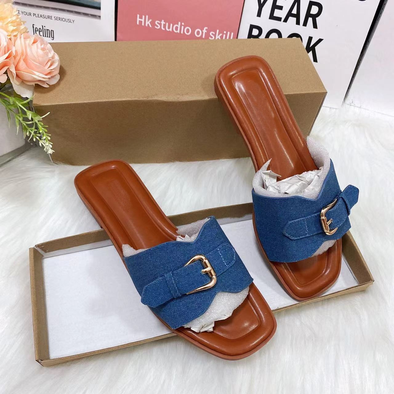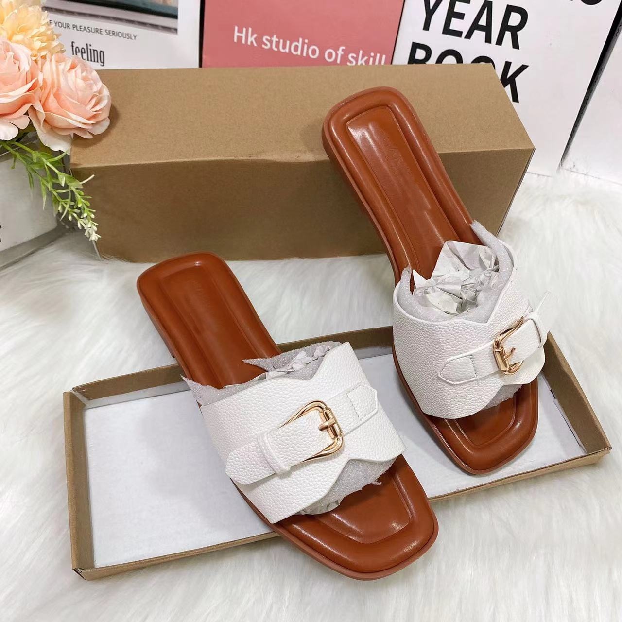 Ins cross-border new European and American plus size sponge cake one line slippers solid color flat bottom decoration buckle thick bottom women's shoes