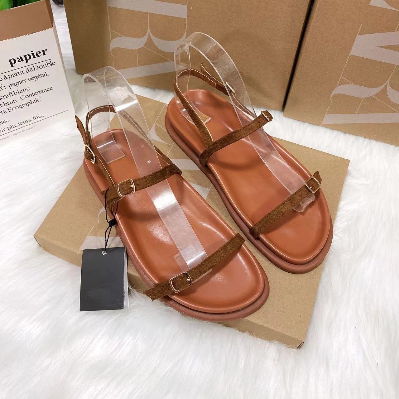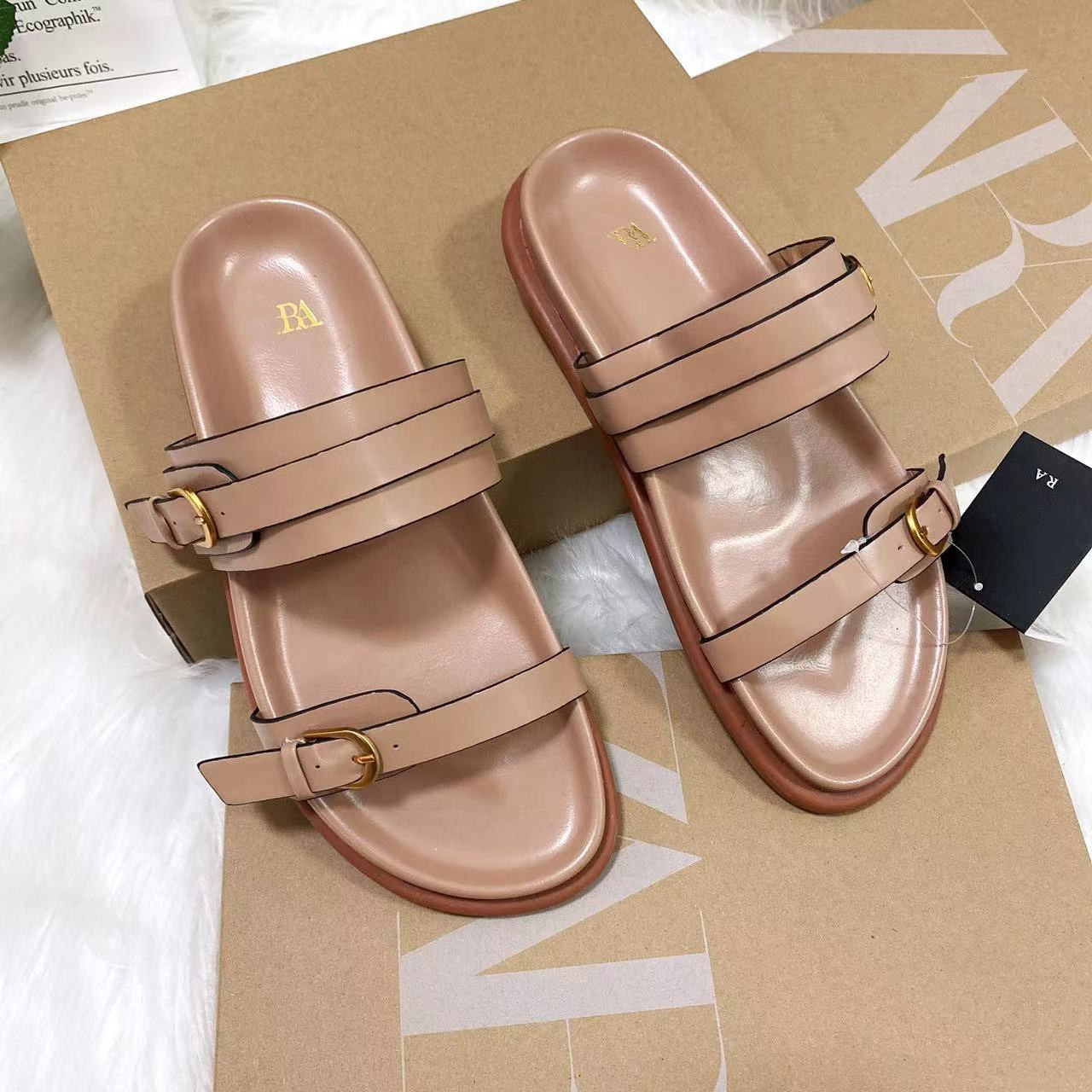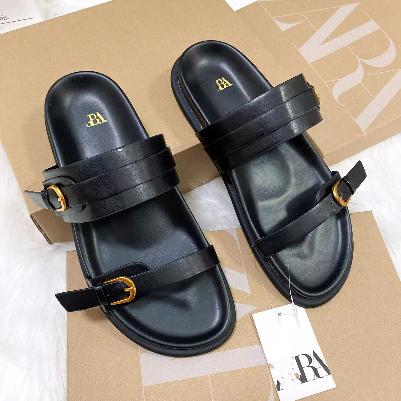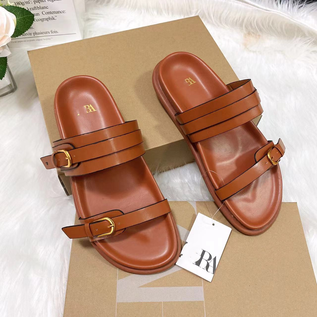 Ins cross-border new European and American plus size sponge cake one line slippers solid color flat bottom decoration buckle thick bottom women's shoes