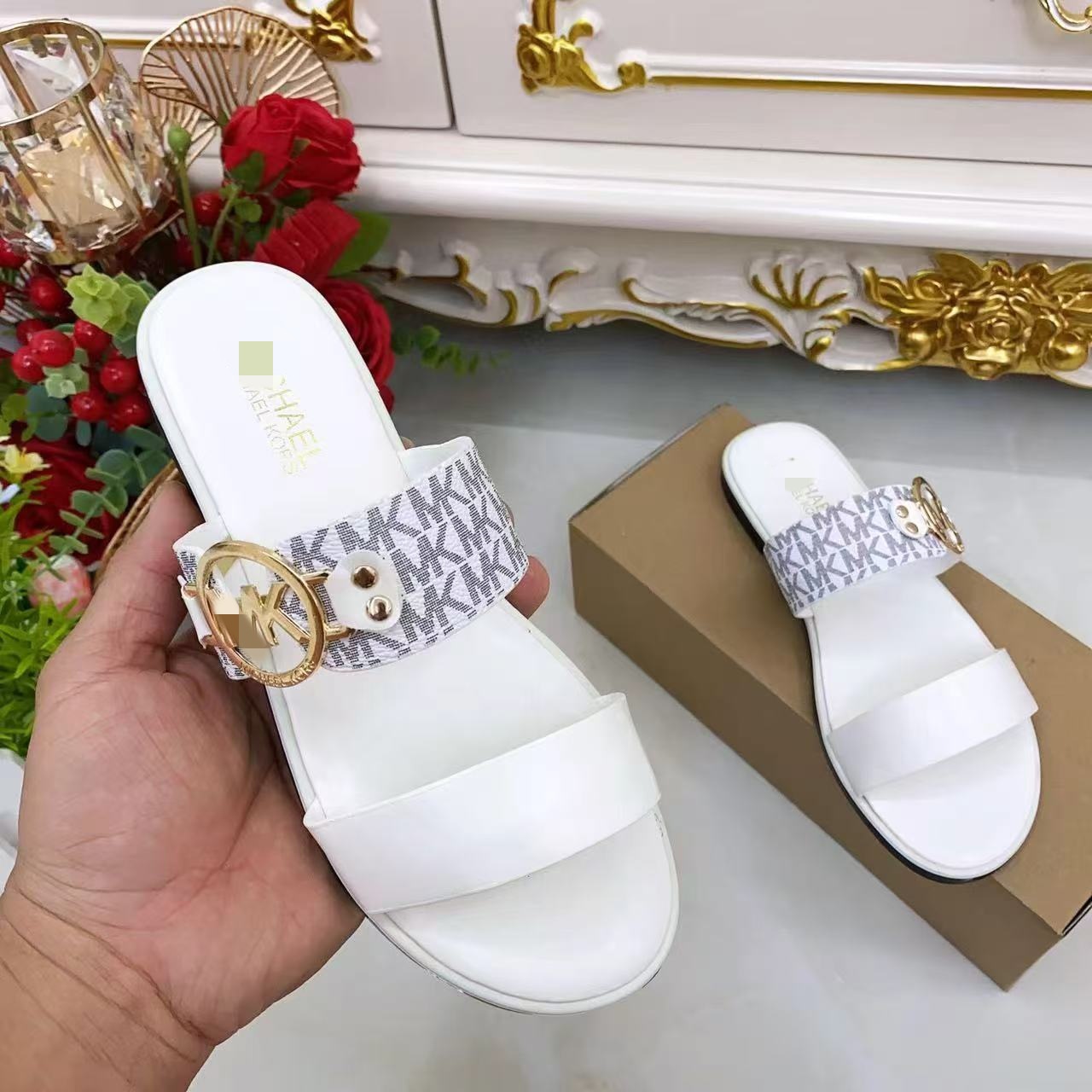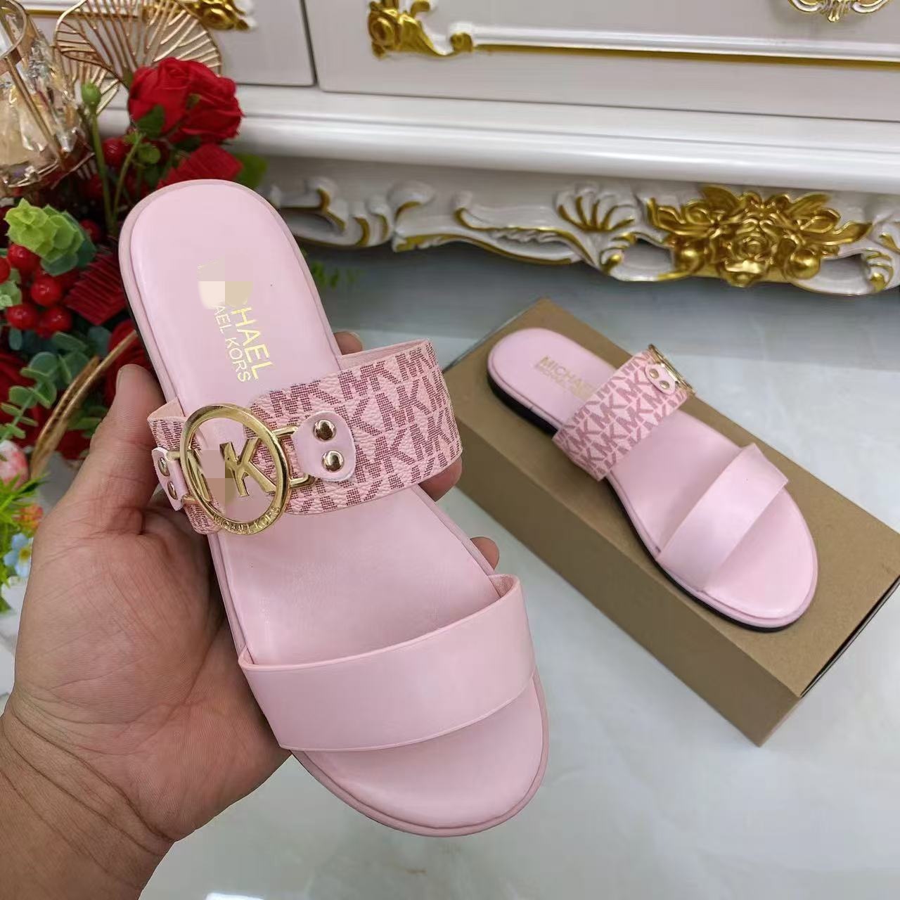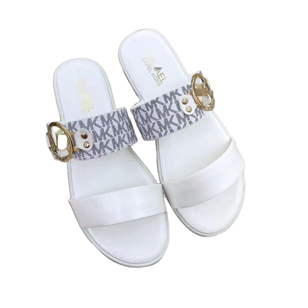M family's new vintage classic fashion metal buckle flat slippers are versatile flat bottomed one line women's shoes slippers
