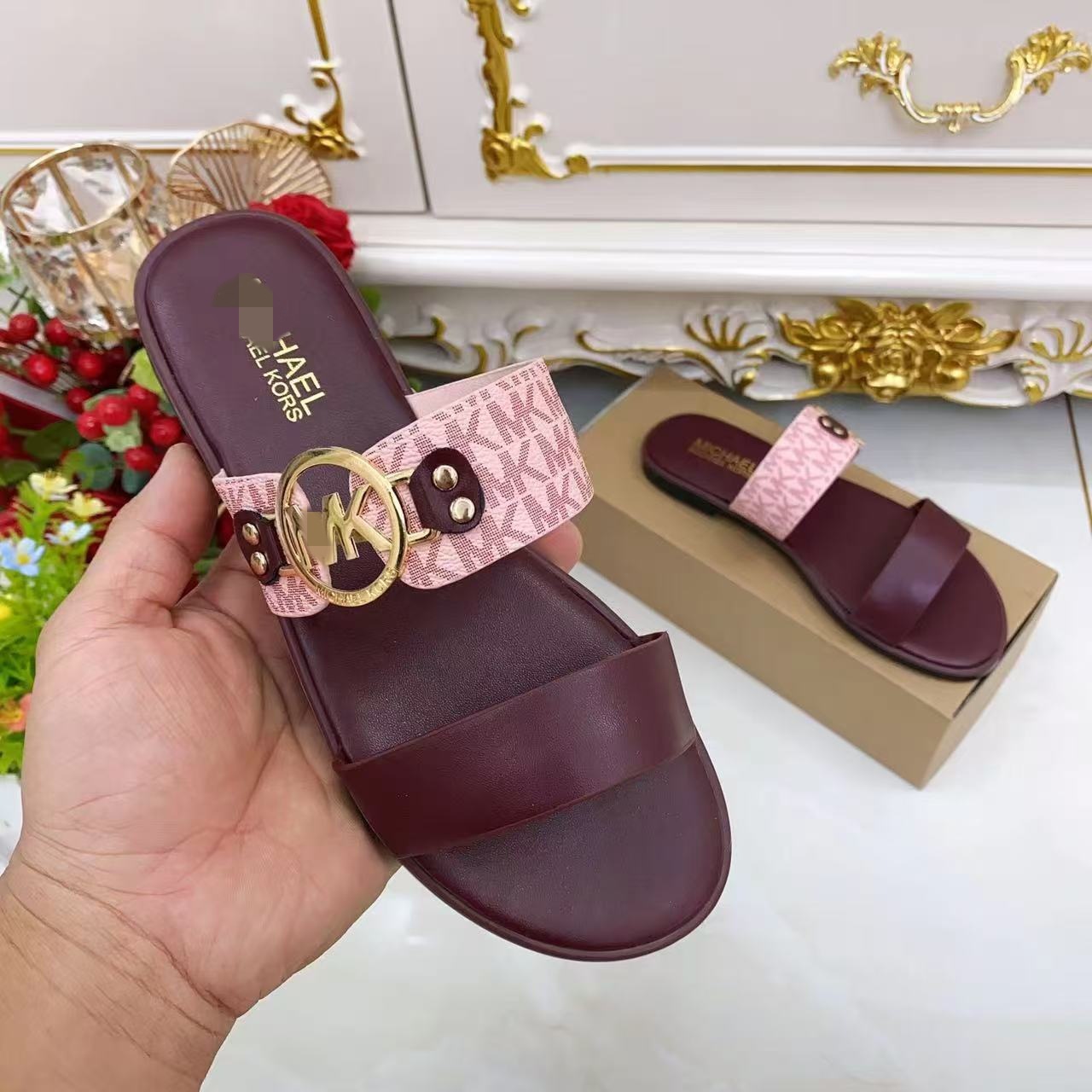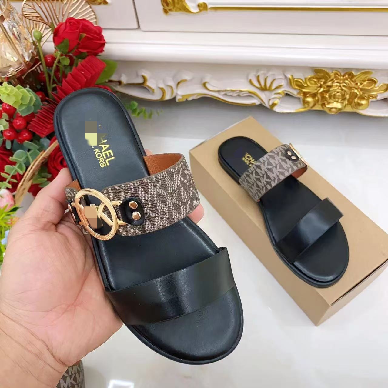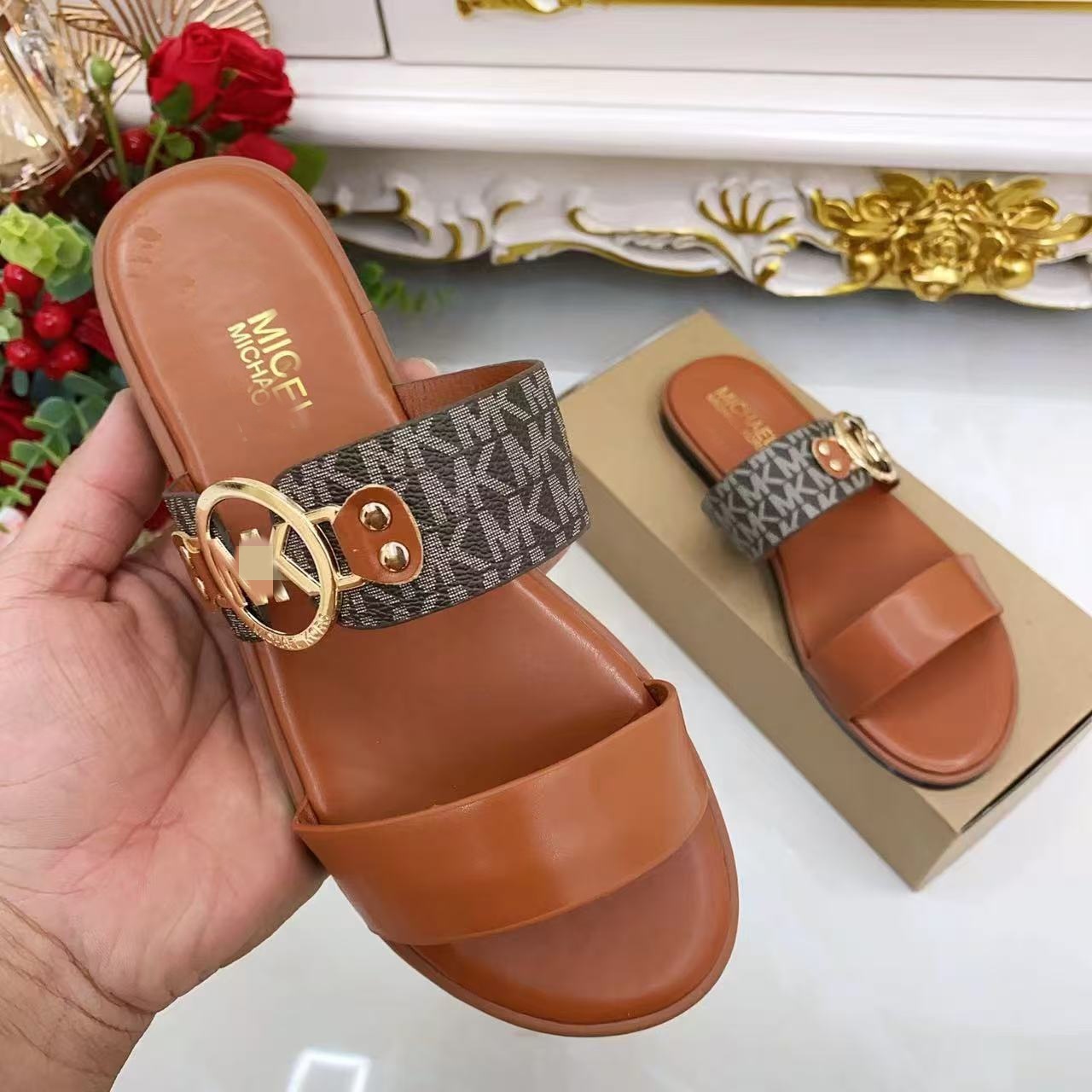 M family's new vintage classic fashion metal buckle flat slippers are versatile flat bottomed one line women's shoes slippers