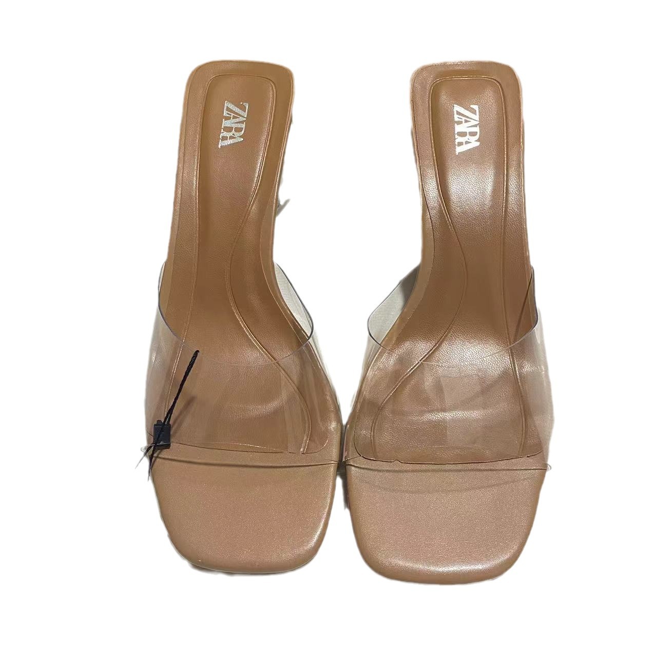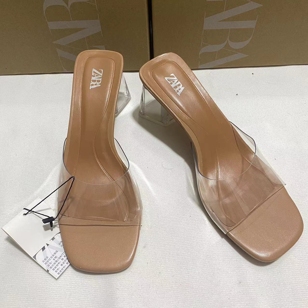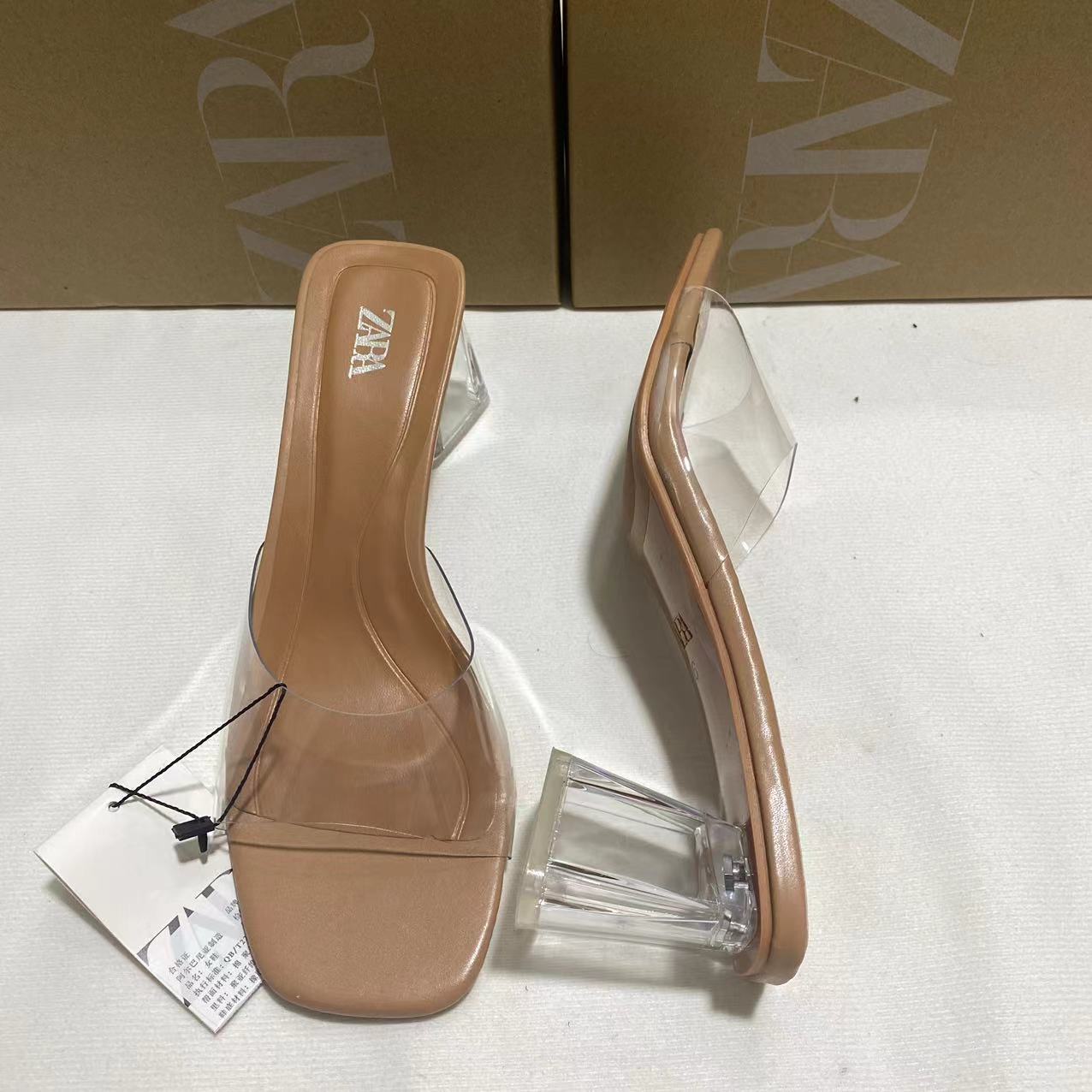 New 2024 women's shoes with square toe PVC exposed toe glass heel and rear exposed heel fashion single shoes sandals for women