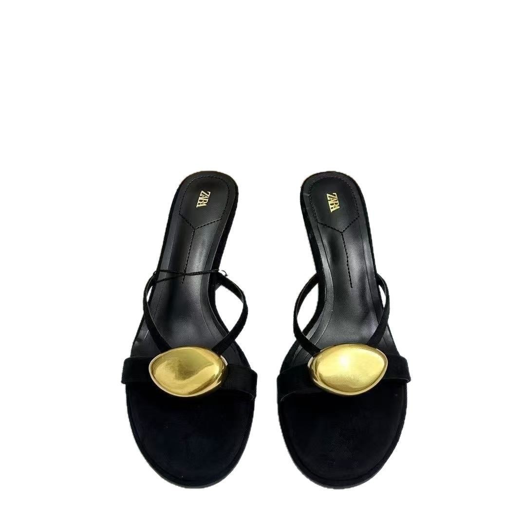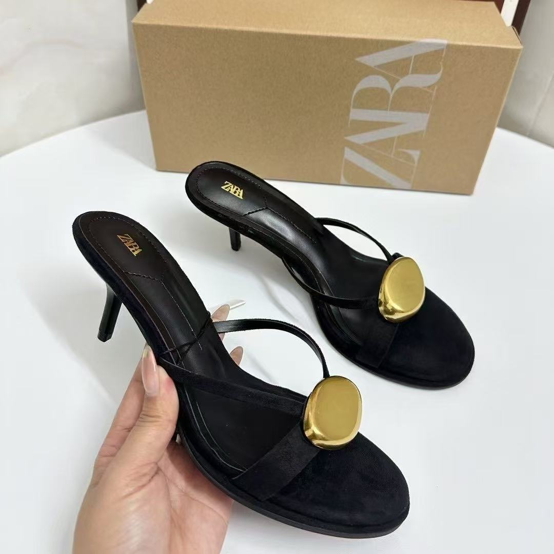 ZA Summer New Product 2025 High Heel Women's Shoes Round Head with Metal Buckle Fashion Rear Air Strap Sandals for Women
