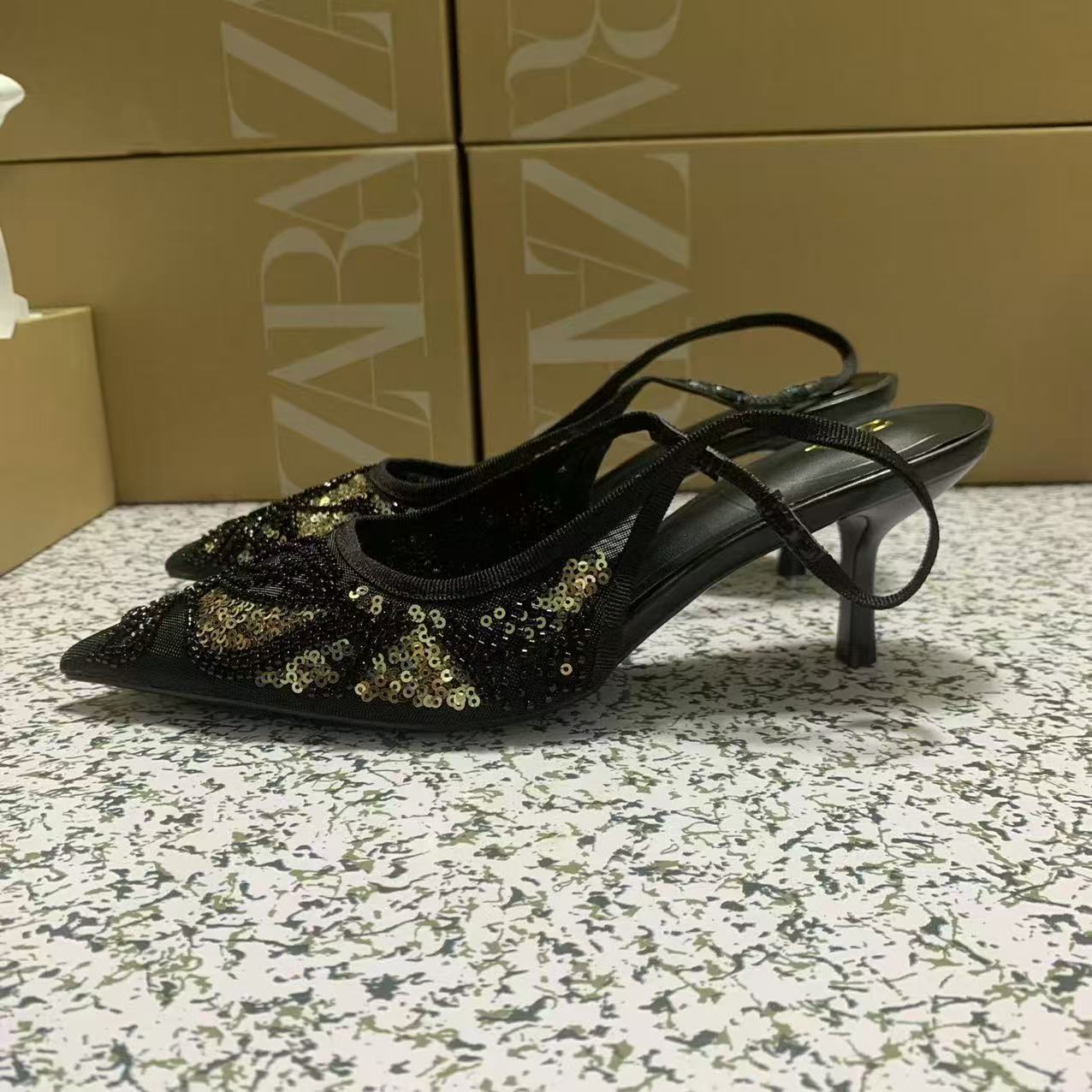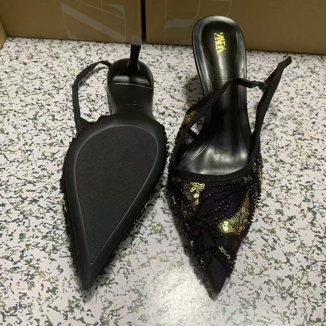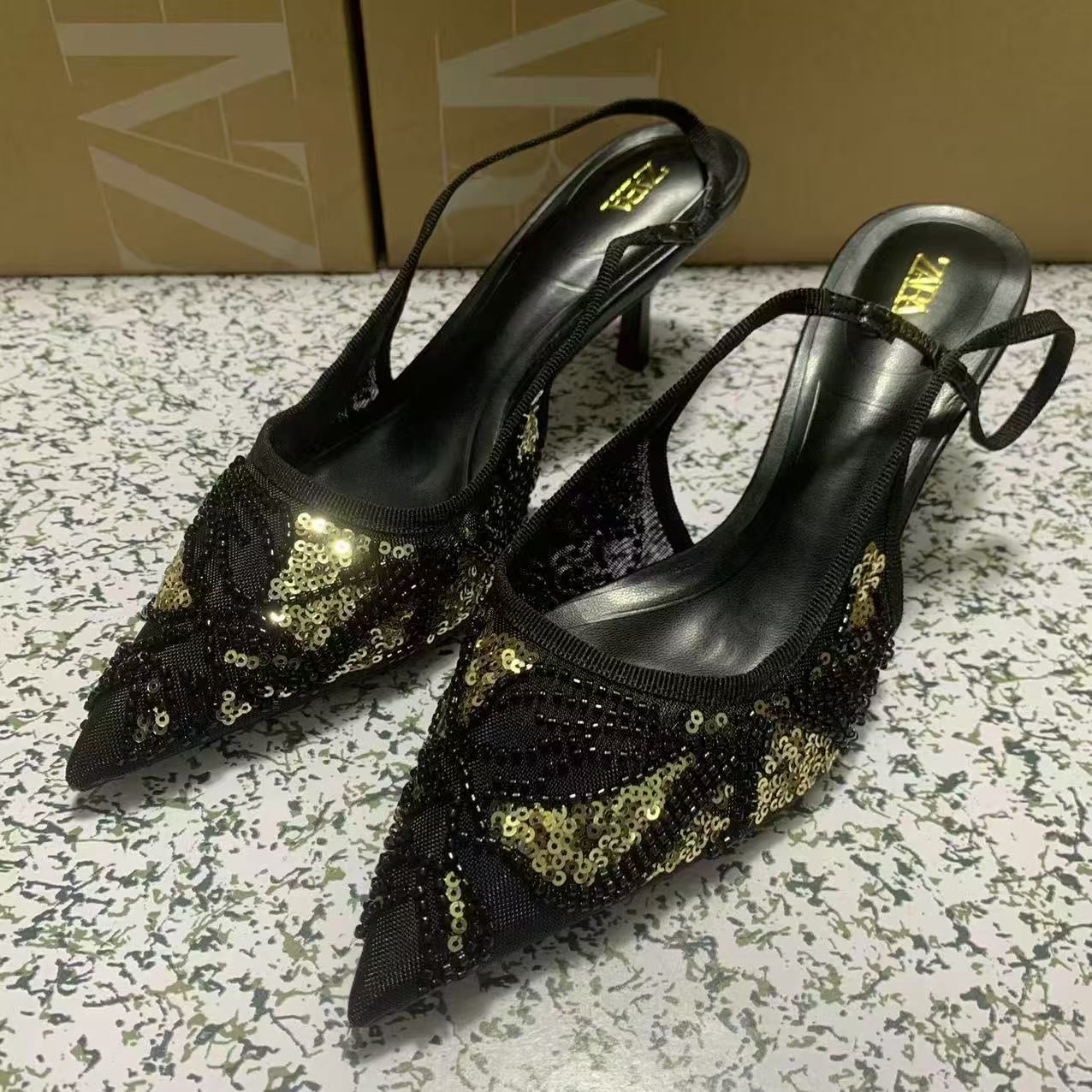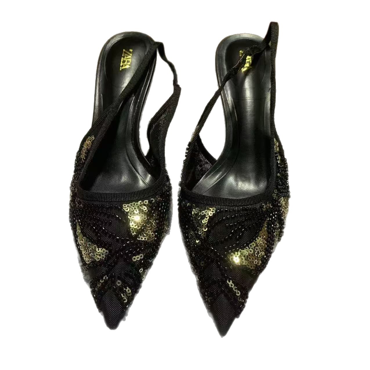 ZA Home 2025 New Women's Shoes Low Heel Elegance High Heel Shoes with Black Gold Shining on the Baotou and Tripping Strap at the Back