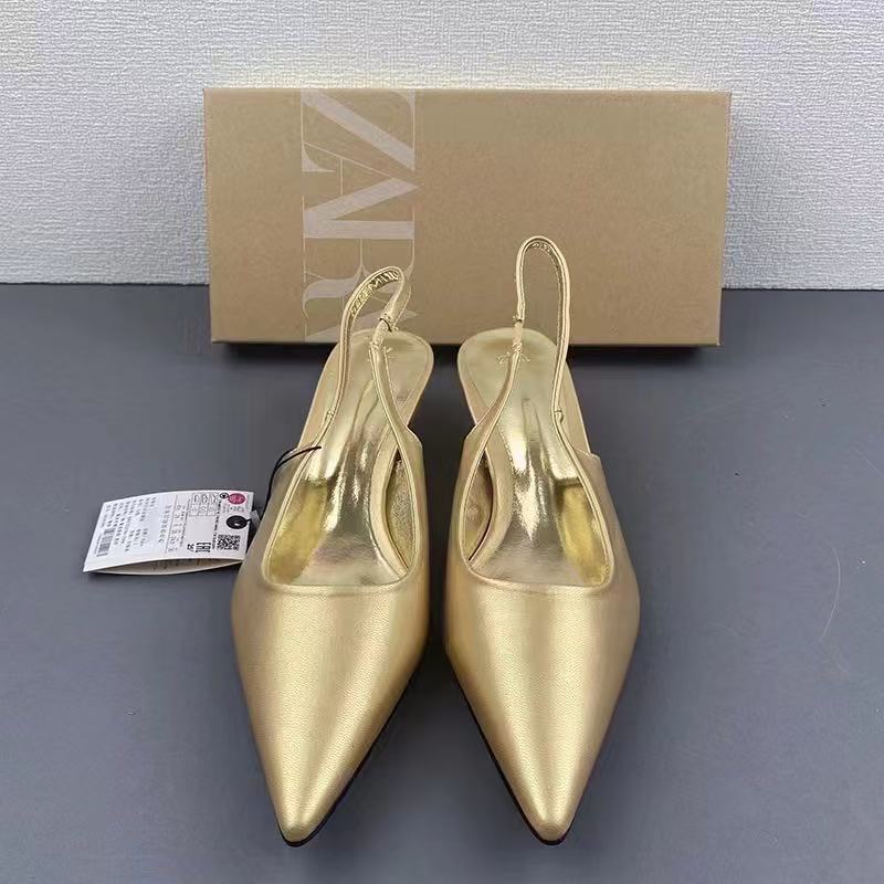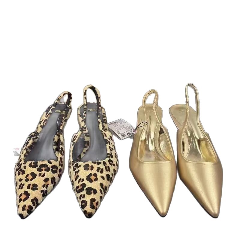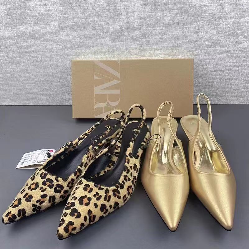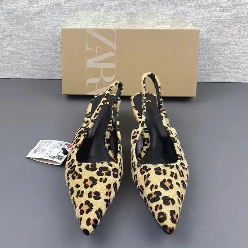 ZA Summer New Product 2024 Fashionable Pointed Low Heel Leopard Pattern Single Shoes for Women, Shallow Mouth Rear Tripover Strap, Exposed Heel, Versatile Sandals for Women