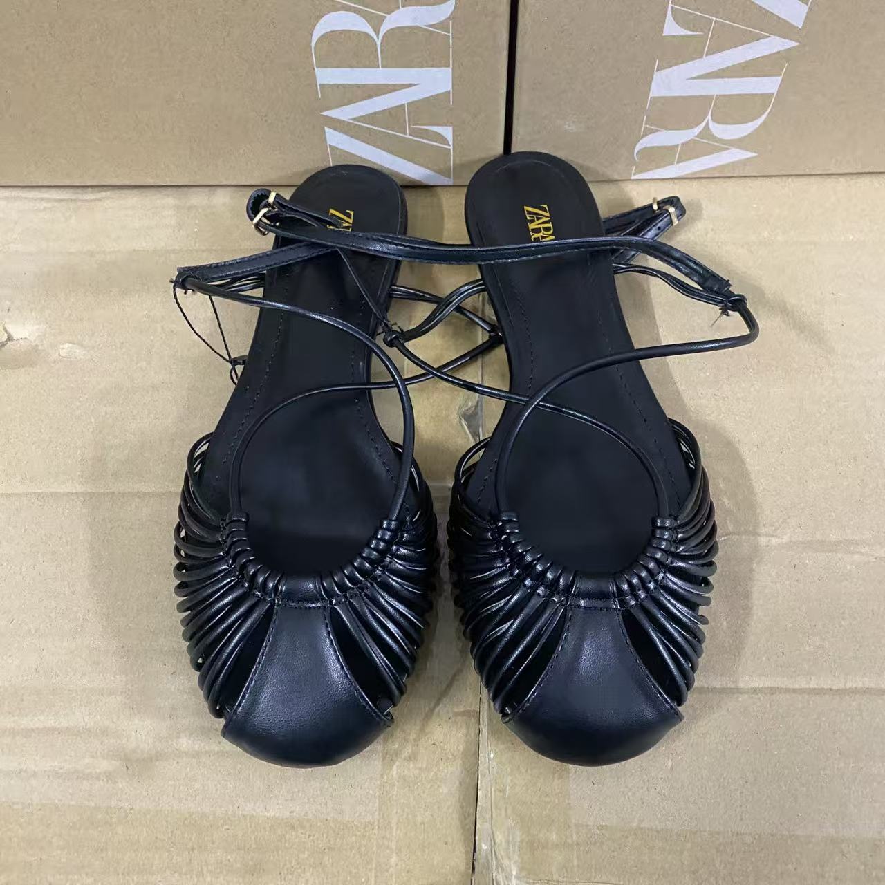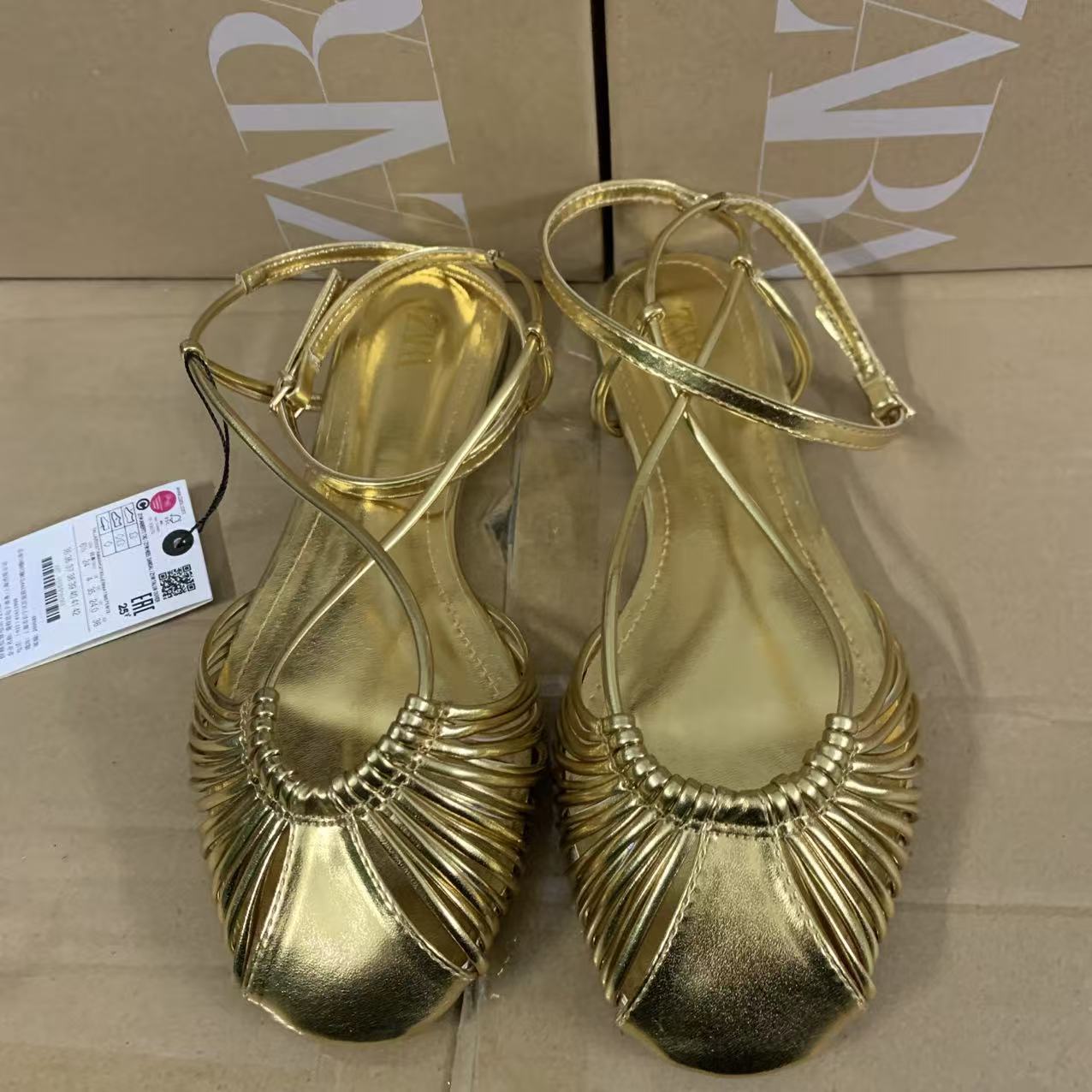 ZA2025 Spring New Women's Shoes with Gold Plated Metal Layer Effect Hollow Round Head Foot Backpack Strap Sandals