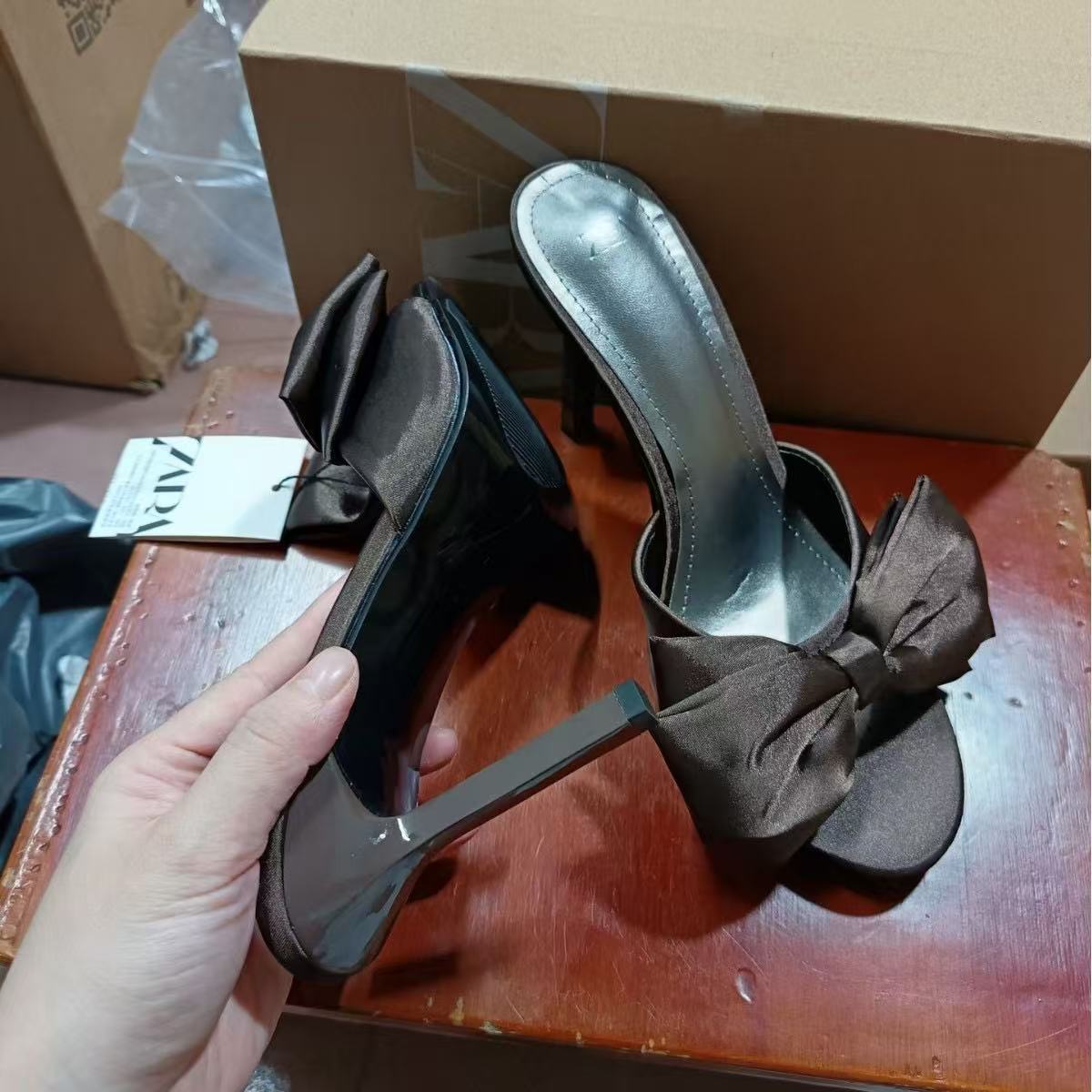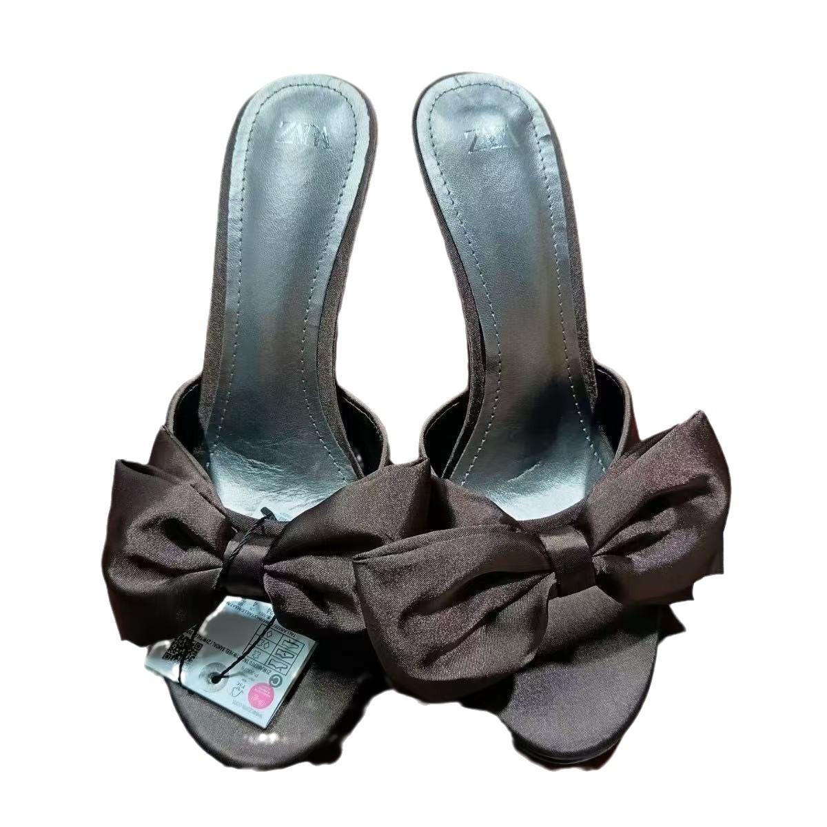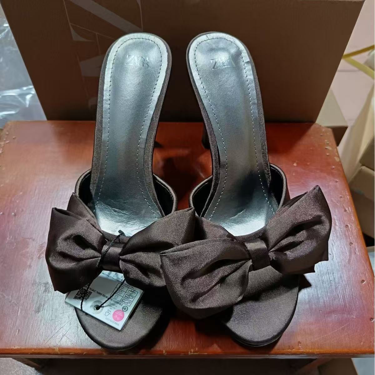 ZA2024 Autumn New Silk Bow Decoration High Heels Round Headed Open Toe Air Cool Slippers Sweet Women's Shoes