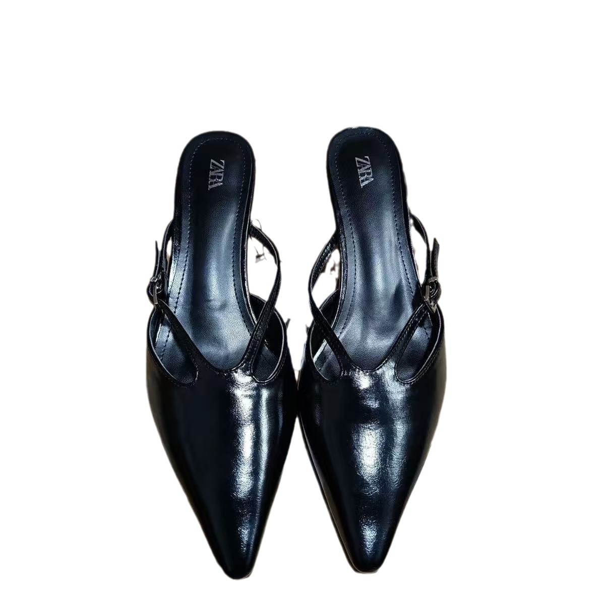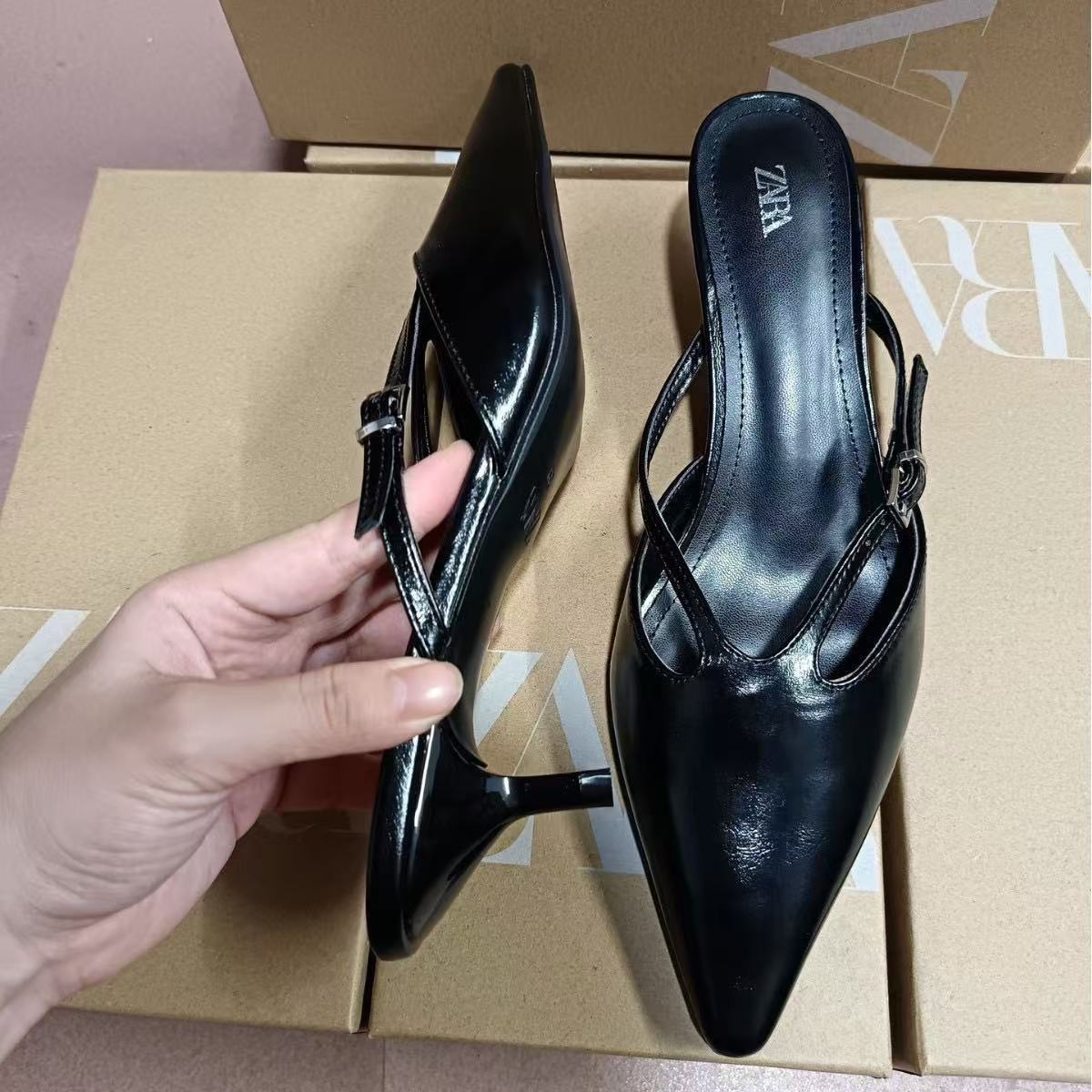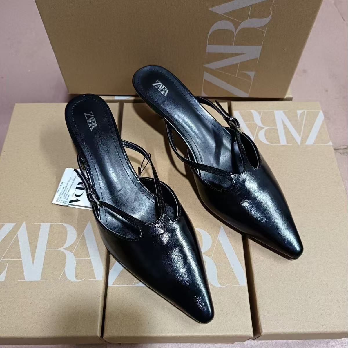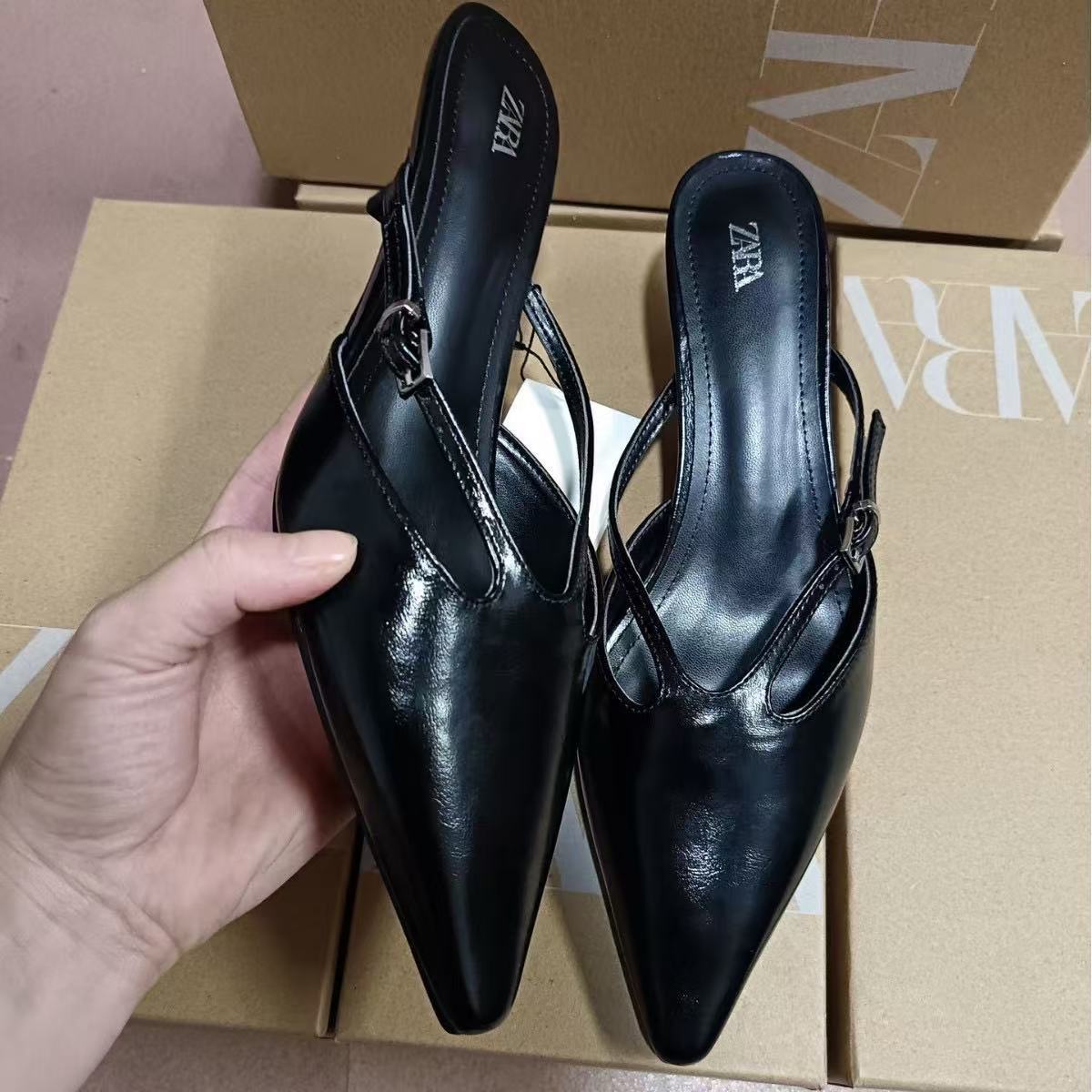 ZA2024 Autumn New Black High Heels Women's Fashion Pointed Temperament Shallow Mouth Open Heels Muller Shoes Slippers Sandals
