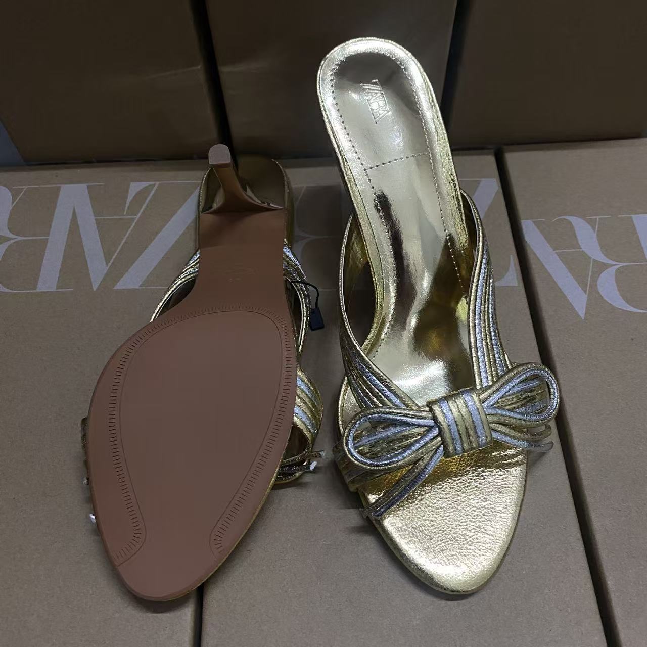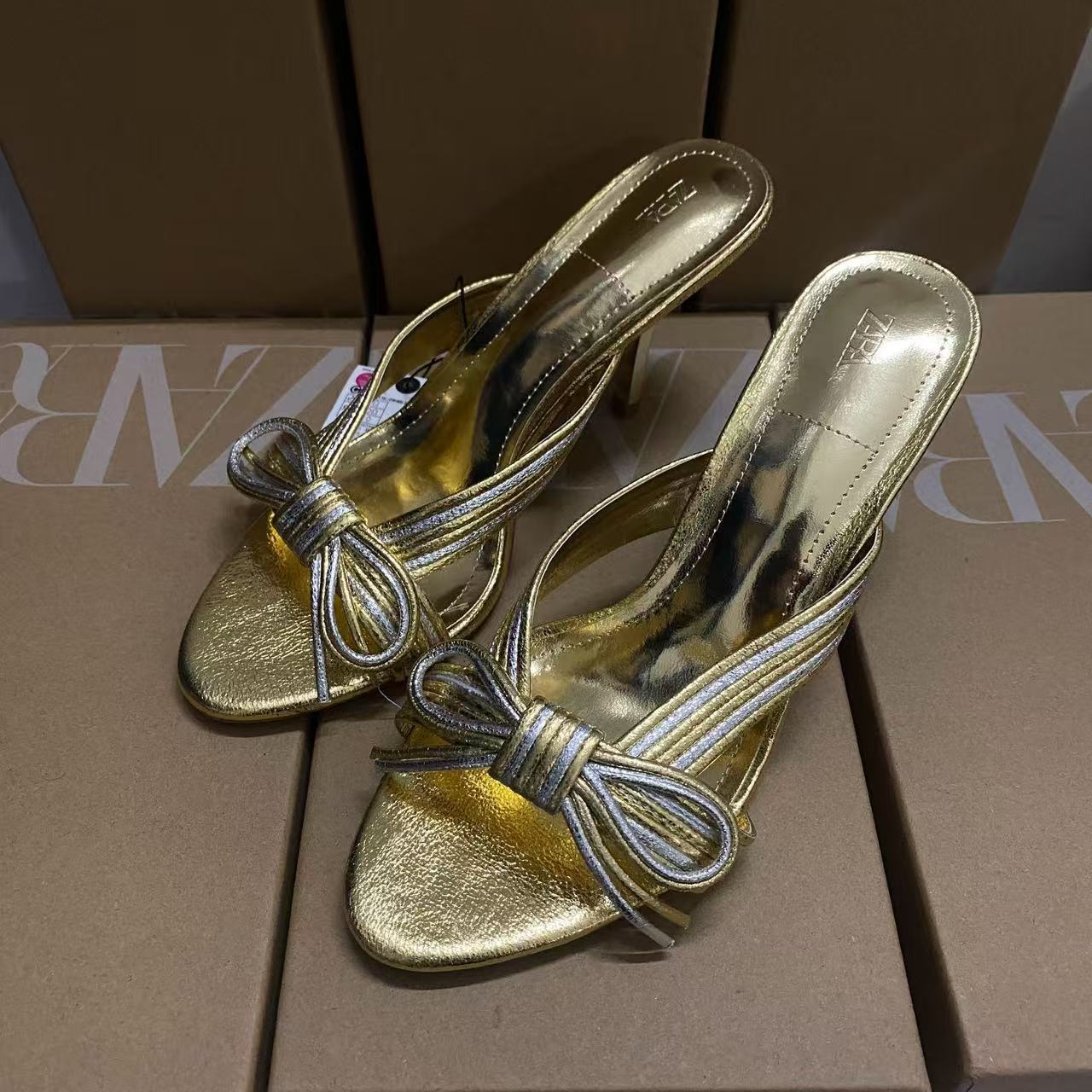 ZA2025 Summer New Round Head Bow Decorative Sandals for Women, Gold European and American Style, Versatile Sandals for Daily Use, Women