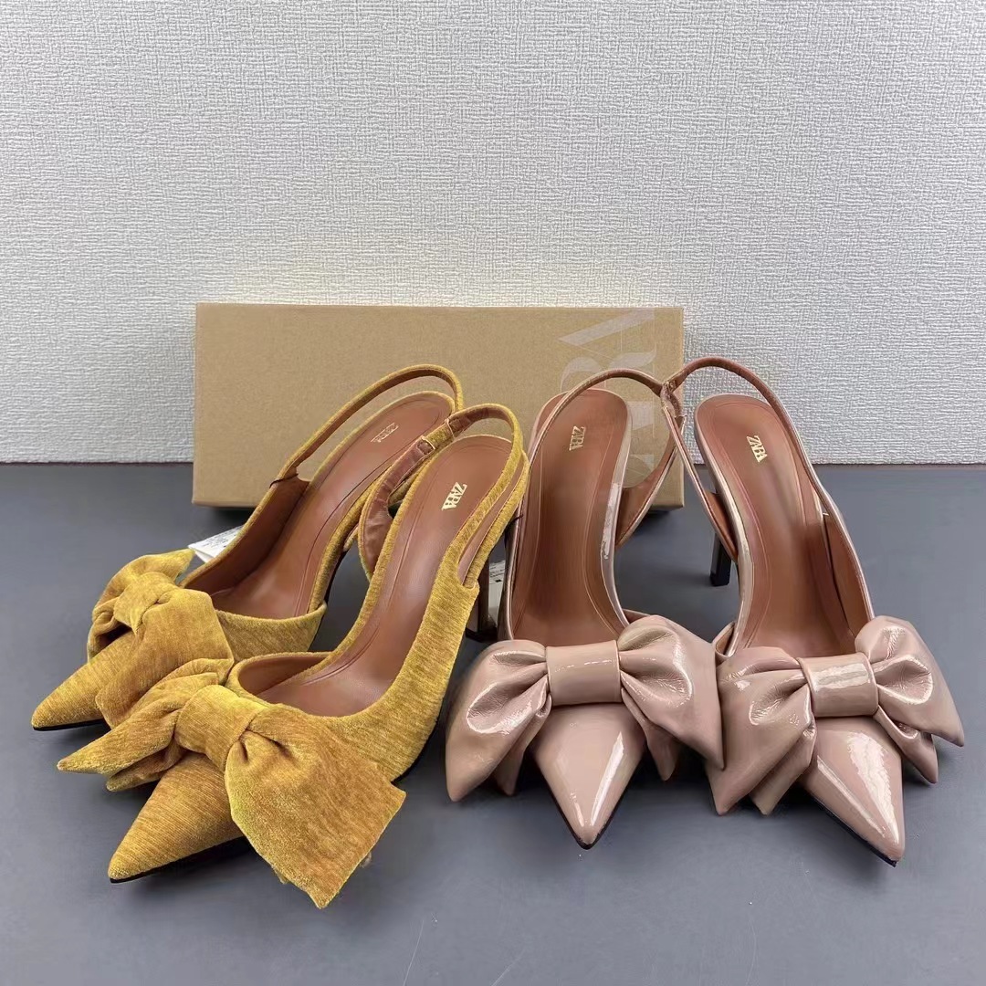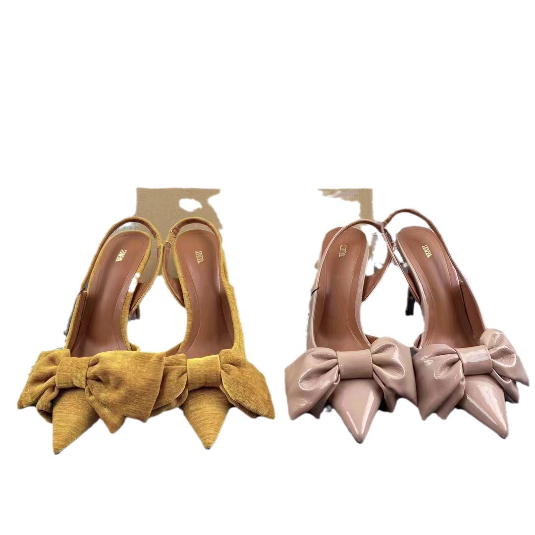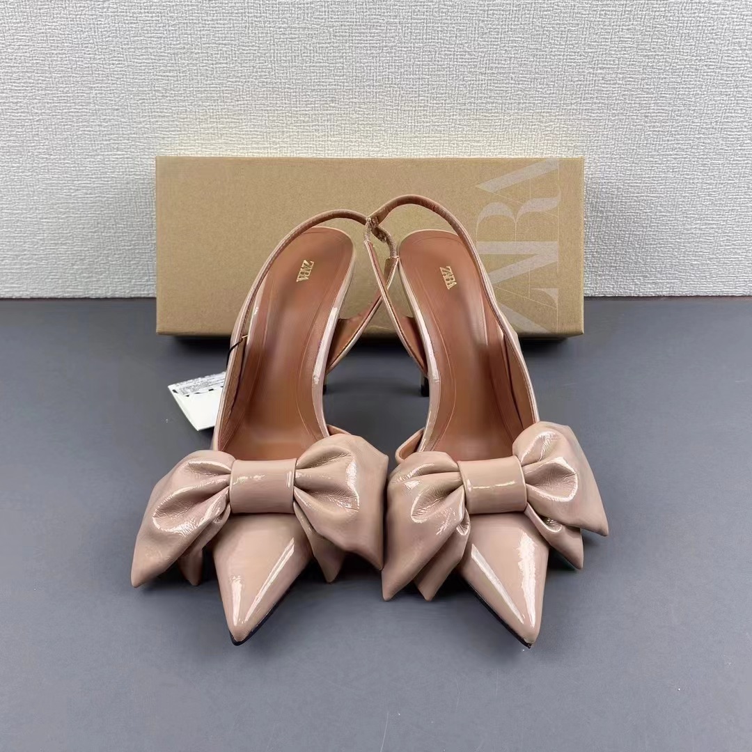 Spain 2024 Summer New Style Lacquered Leather Shallow Mouth Women's Shoes with Bow Decoration Pointed High Heels Muller Sandals