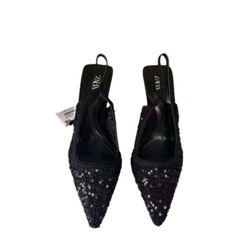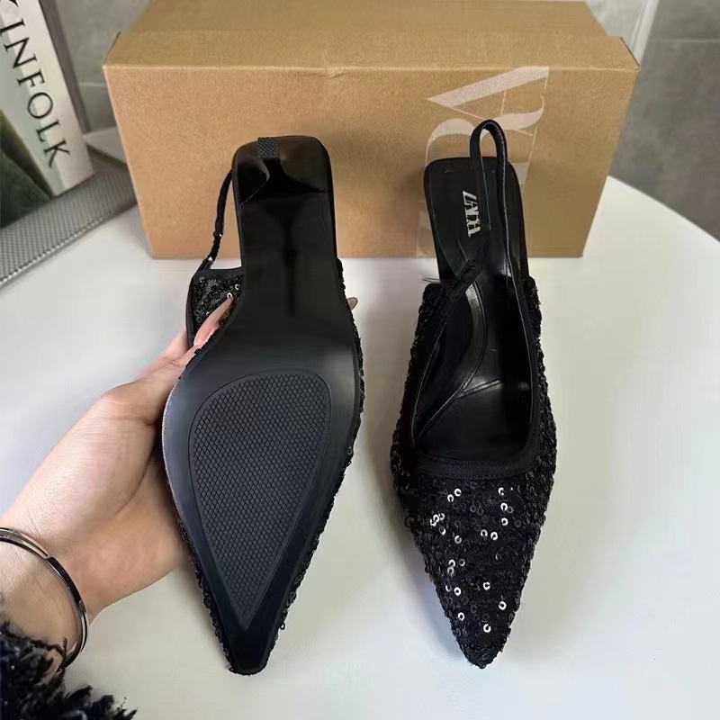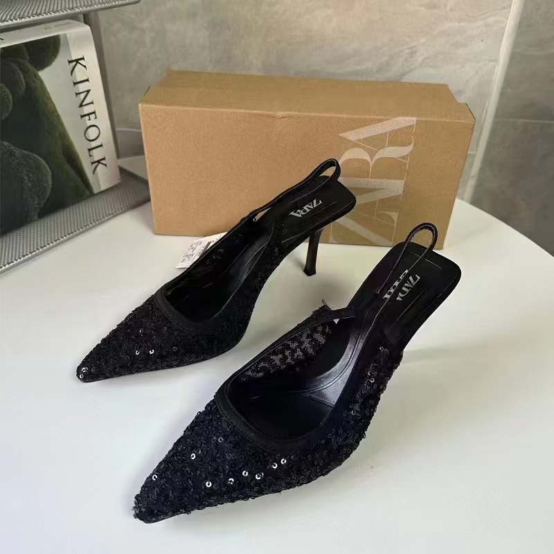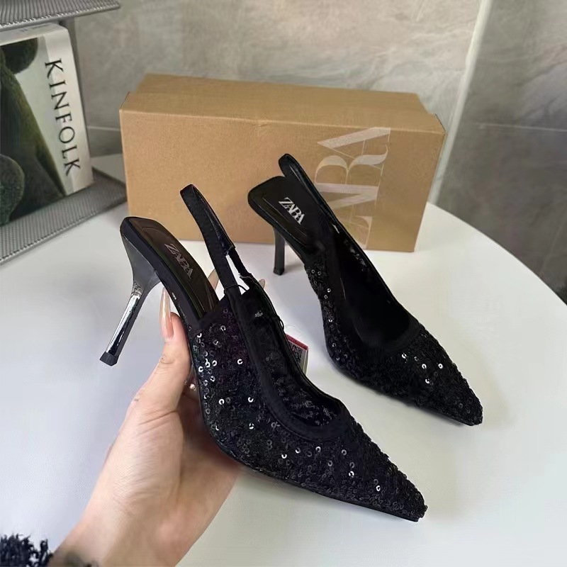 ZA 2024 Summer New Shallow Mouth Pointed Single Shoes for Women, Shining High Heels, Thin Heels, Sandals, Rear Strap Women's Shoes