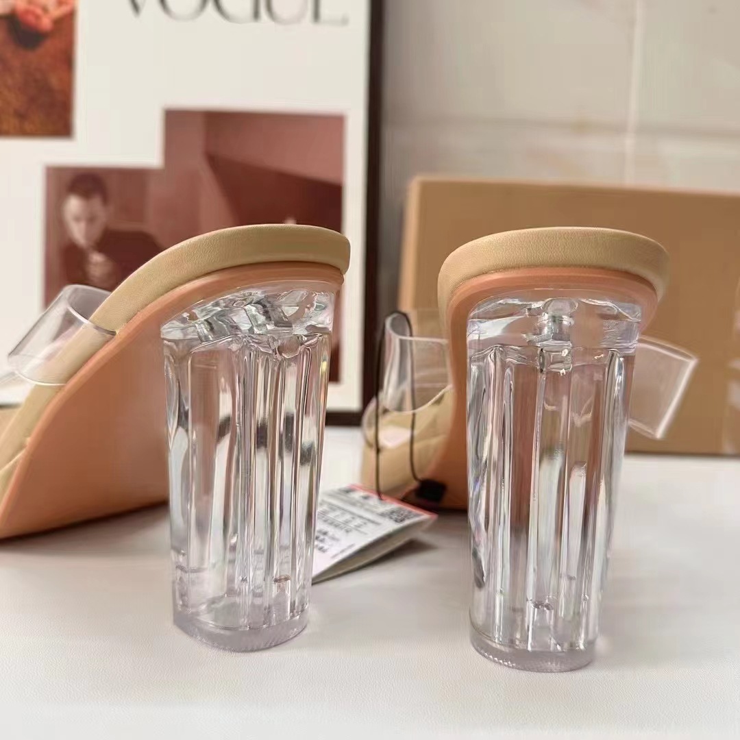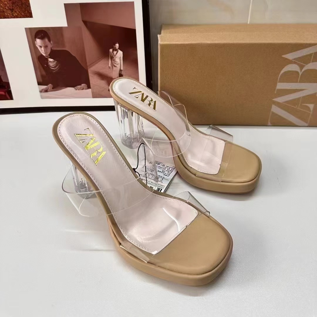 ZA Summer New Product 2024 High Heel Women's Shoes Square Head One Word PVC Fashion Shallow Mouth Transparent Heel Coarse Heel Sandals for Women