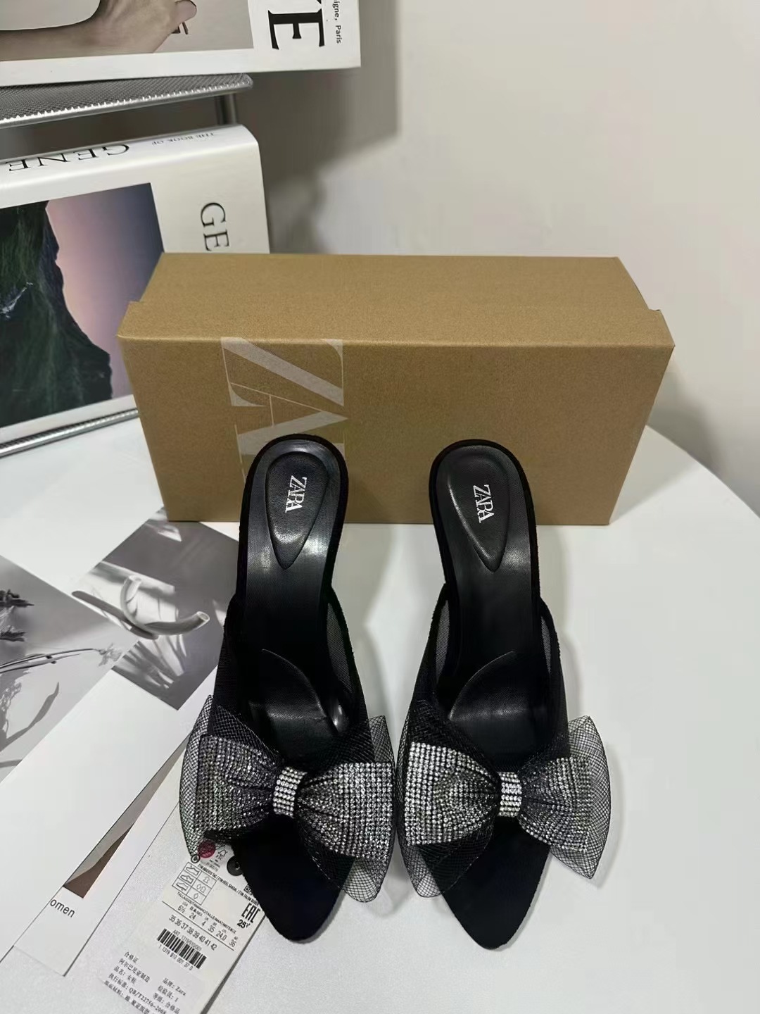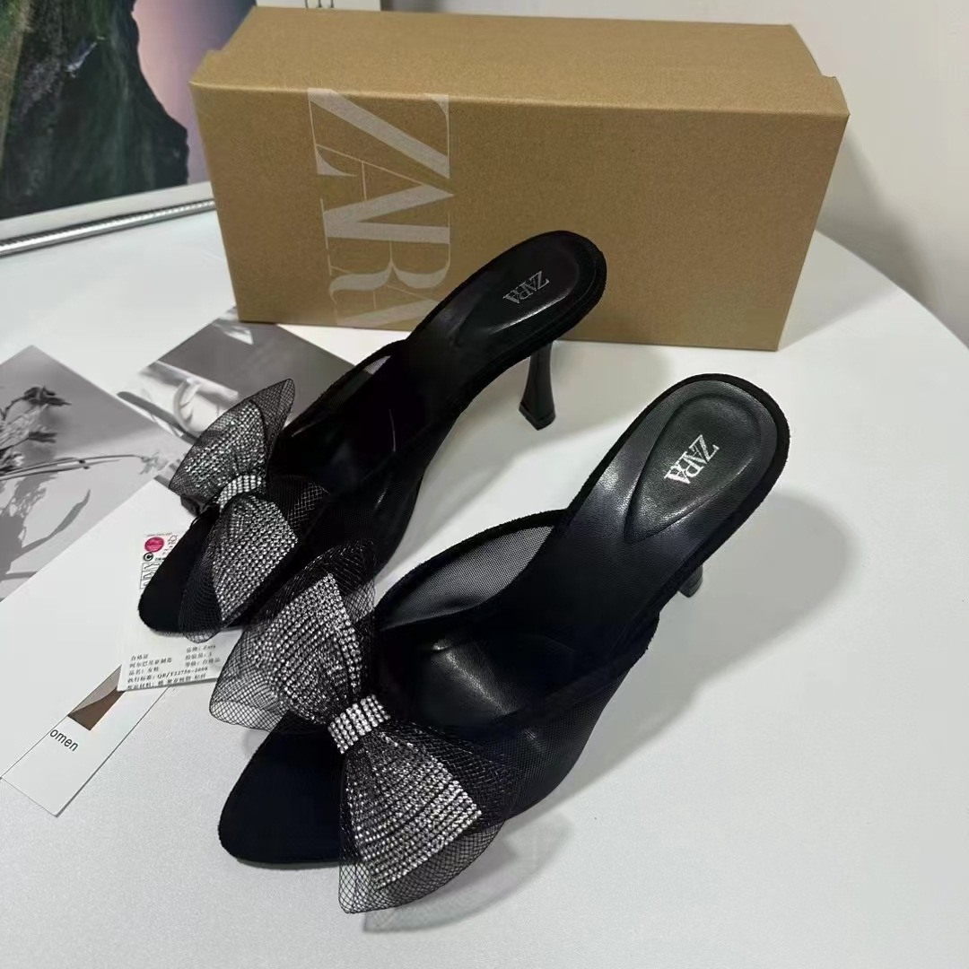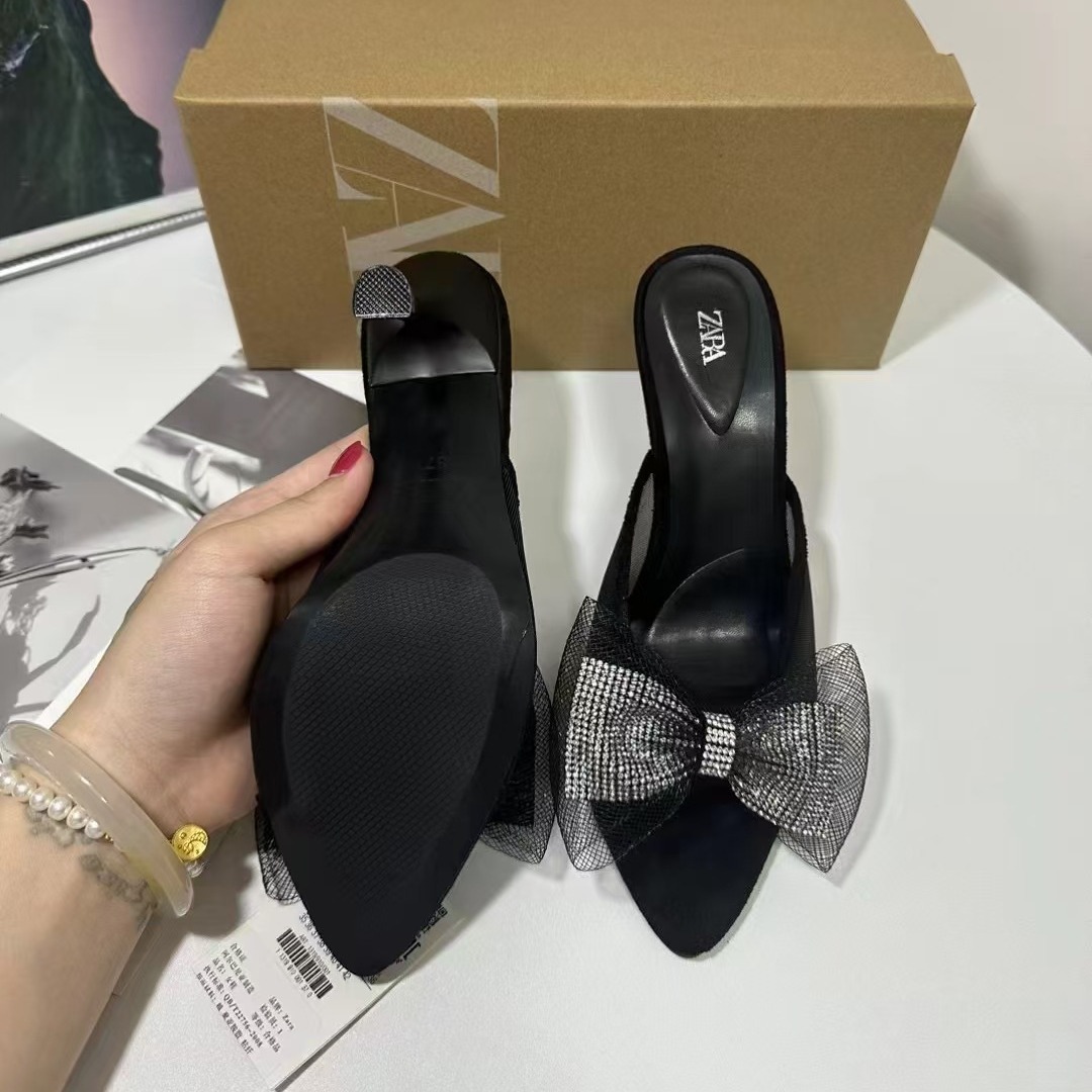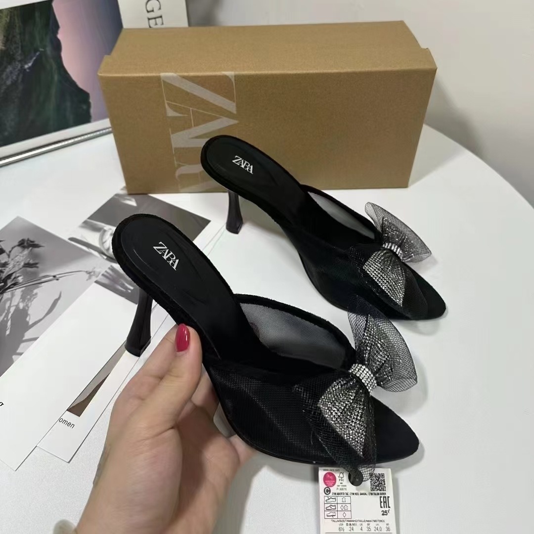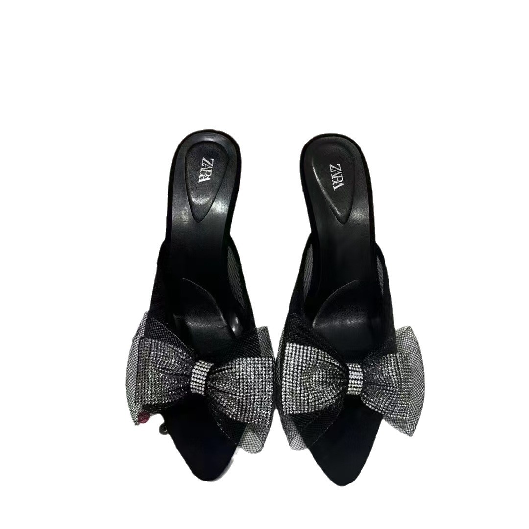 ZA New Product 2024 French Summer Pointed Toe High Heel Shallow Bow Water Diamond Shining Decoration Rear Air Heel Sandals