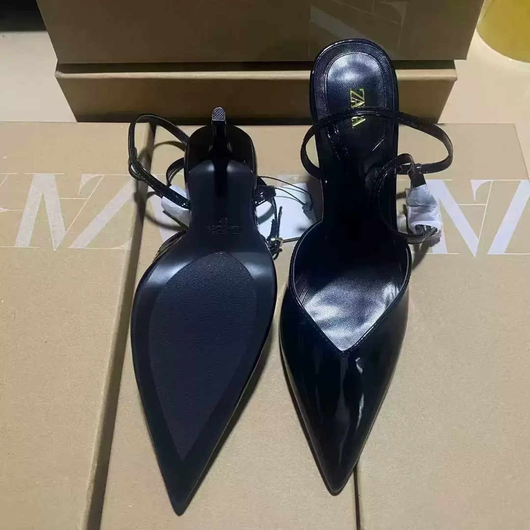 Za2025 Spring New Product: Lacquered Leather Effect with Decorative Pointed High Heels, Dew Heels, Fine Heels, Muller Shoes, Headless and Empty Sandals