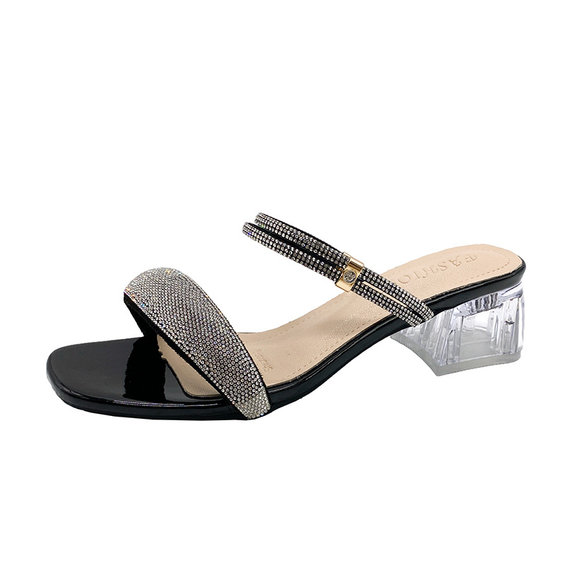 2024 new summer one-piece high-heeled sandals with rhinestones, exposed toes, thick heels, medium to high square toe women's sandals