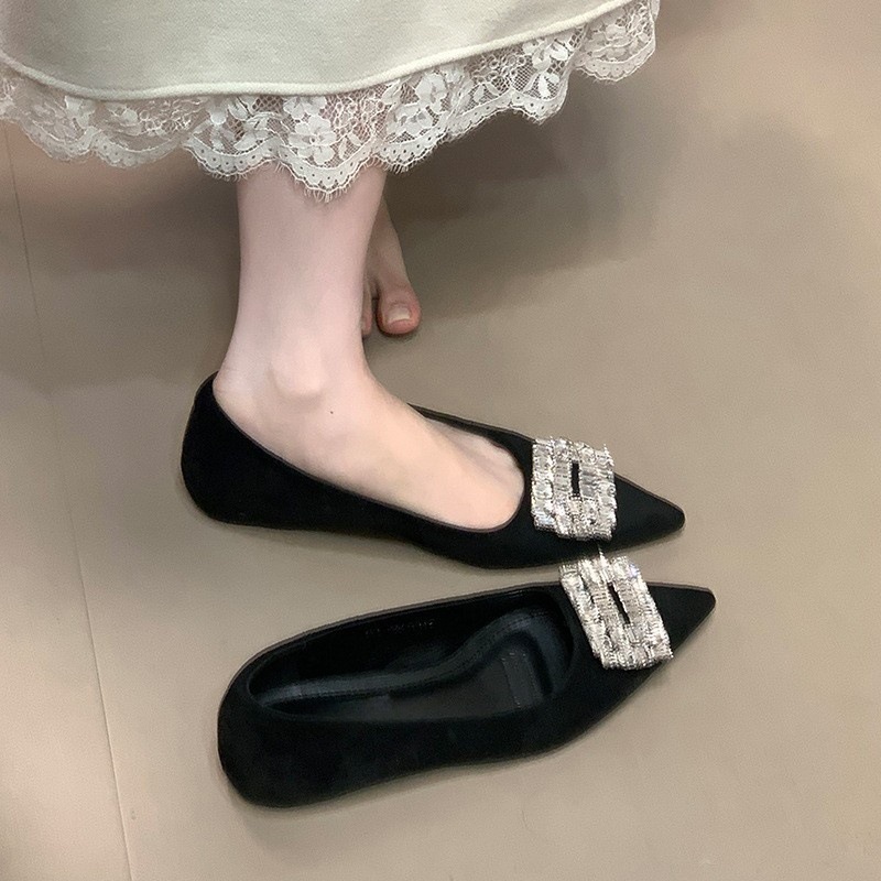 Fashionable interior height increasing versatile evening shoes, shallow mouth rhinestone square buckle scoop shoes, pointed temperament single shoes for women